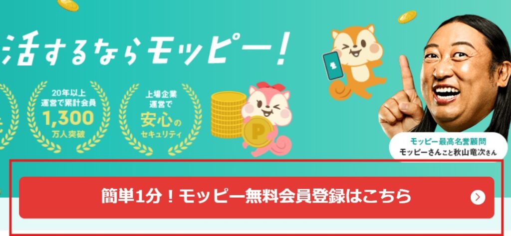 モッピーは株式会社セレスが運営しているポイントサイトです。累計会員数は1,300万人以上(2026年時点)という人気度を誇るポイントサイト。ポイントの交換レートは「1ポイント=1円」と計算しやすいうえに獲得ポイントは、現金や電子マネーに換金できます。